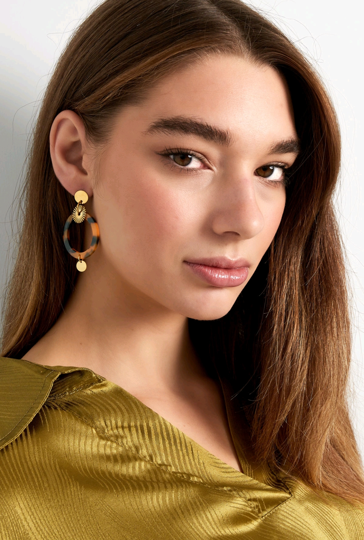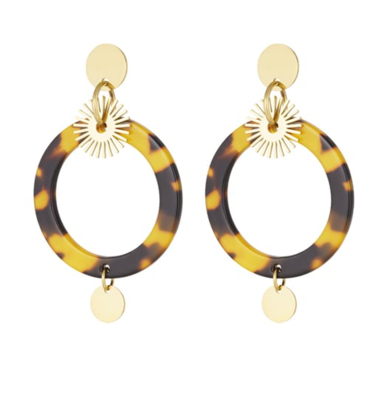 Mooie oorbellen bestaande uit een cirkel in het goud en bruin print.Chique maar ook goed te combineren met andere oorbellen voor een iets speelsere uitstraling.
